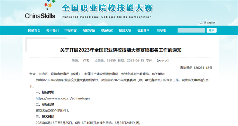 为确保2023年全国职业院校技能大赛顺利举办,6月15日,全国职业院校技能大赛执行委员会发布通知,决定启动2023年大赛赛项(除开幕式赛项外)的报名工作。