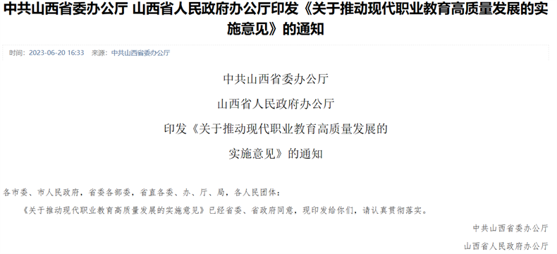 为全面落实全国及全省职业教育大会精神,根据中共中央办公厅、国务院办公厅印发的《关于推动现代职业教育高质量发展的意见》等文件精神,近日,中共山西省委办公厅 山西省人民政府办公厅印发《关于推动现代职业教育高质量发展的实施意见》的通知。